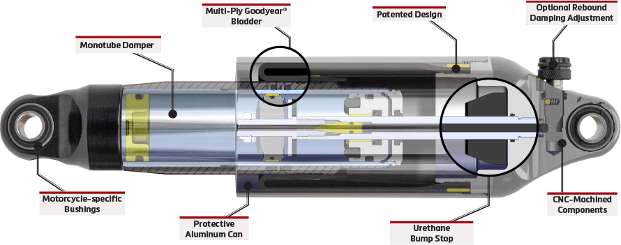 Arnott kits are designed and tuned specifically for motorcycles. Even if the air spring sleeve is fully deflated, the fender won’t touch the tire unlike automotive-designed shocks installed on motorcycles. Since Arnott’s TruAIR® Suspension is true onboard adjustable air suspension, it helps to significantly reduce issues seen in air cylinders or ‘air-assisted’ shocks such as bouncy rides and the danger during evasive maneuvering or hard riding.